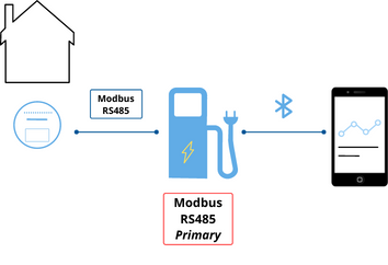We plaatsen op kop van de installatie een energiemeter die verbonden wordt via modbus RTU (RS485) met de laadpaal. De slimme laadpaal kan geconfigureerd worden via bluetooth op de smartphone of via het online portaal (ChargerSync web portaal).
