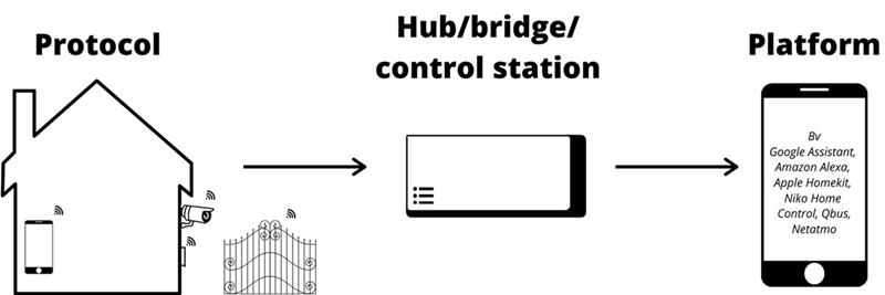 De taal waarin de smart home producten communiceren heet een protocol. Bekabelde smart home systemen maken gebruik van een bussysteem dat onderling communiceert via een leverancierafhankelijk protocol. De leverancier kan steeds zelf beslissen welke protocollen men toelaat op het systeem voor een stabiele werking. Intussen kan je door middel van een interface of universeel protocol toch verbinding maken, zoals Google Home met Niko Home Control. Om deze met elkaar te verbinden heb je een bridge nodig.